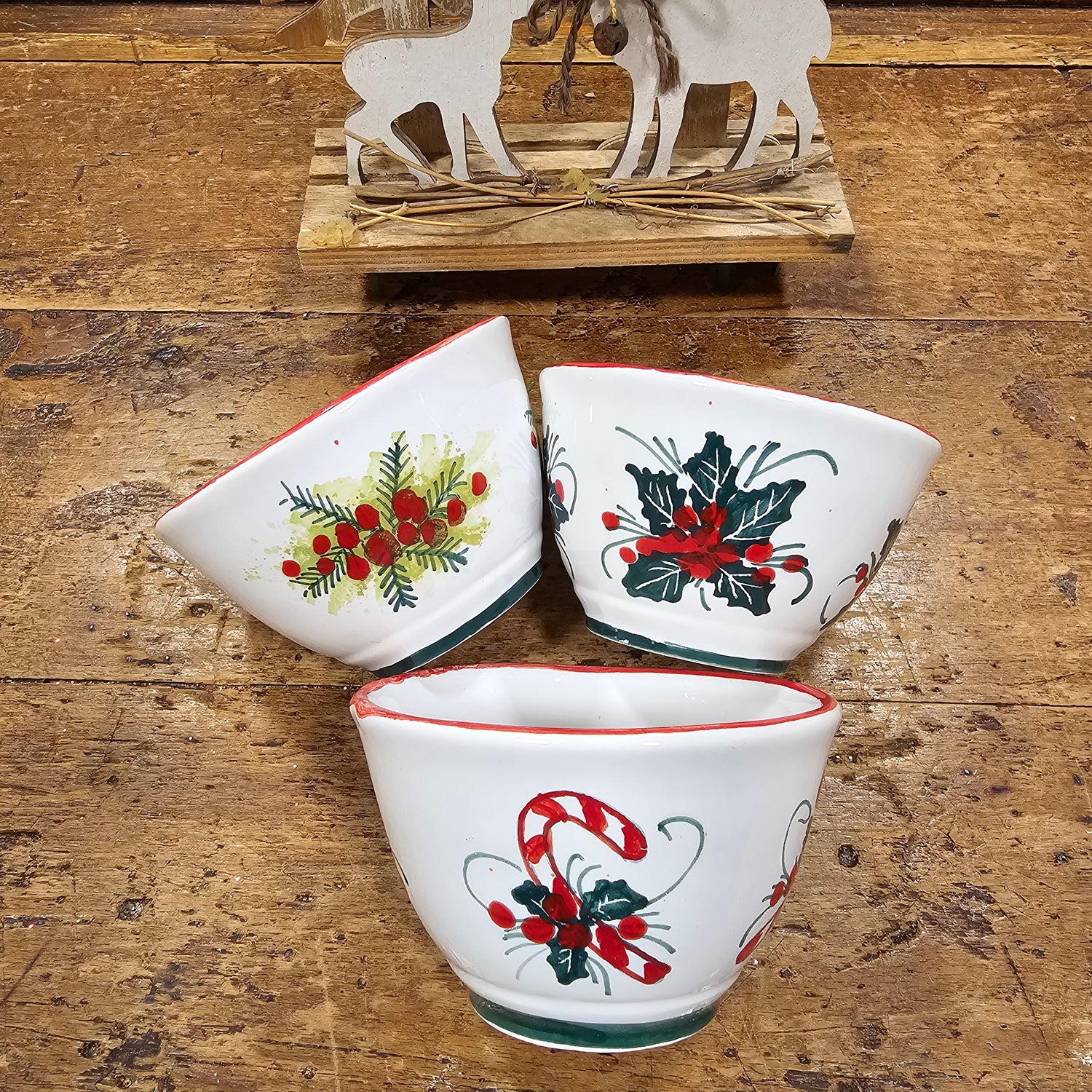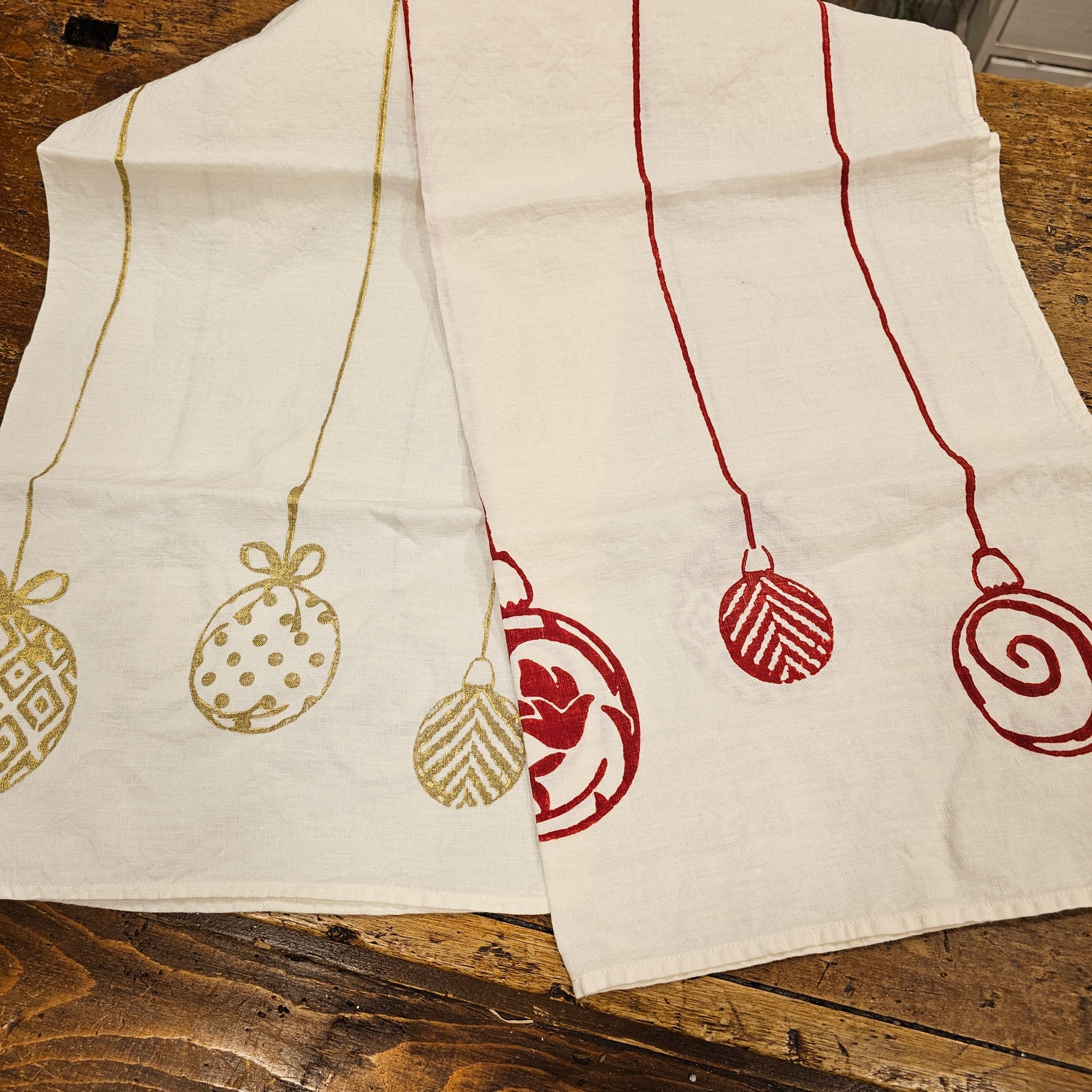 Christmas table runners hand-printed by expert craftsmen with bows and hearts prints,...
